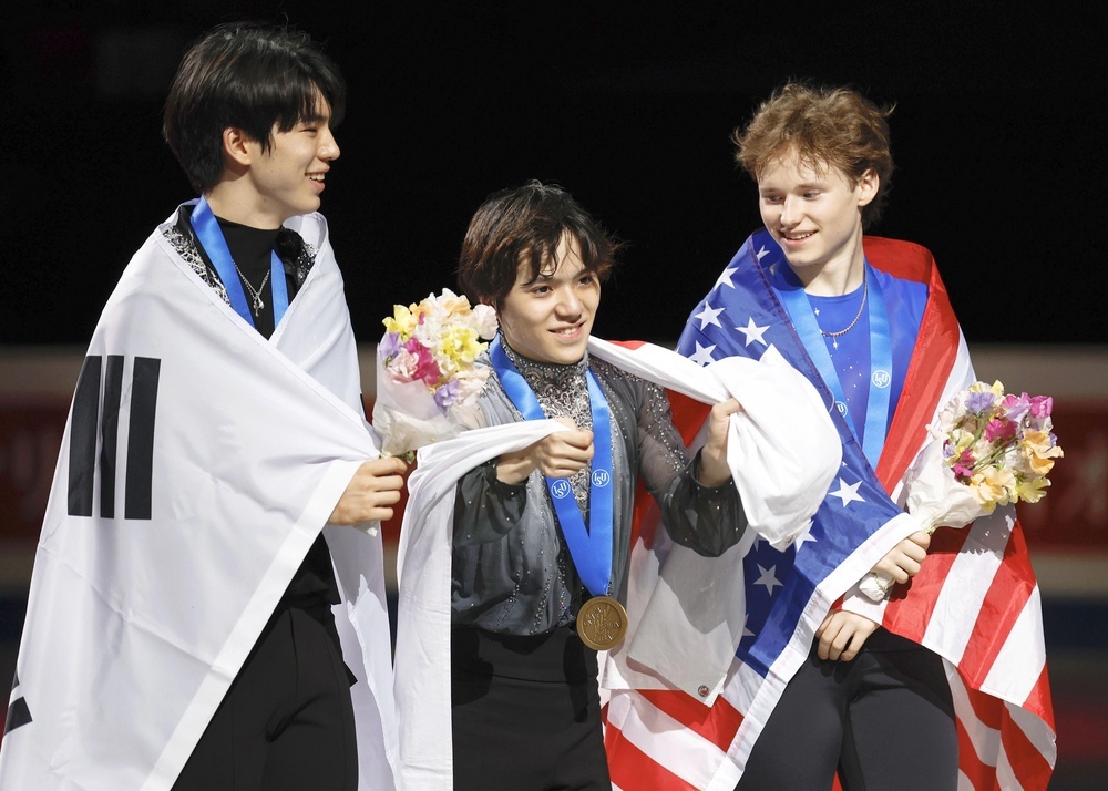 羽生結弦さんのプロ転向で新時代に入ったフィギュアスケート男子。大技クワッドアクセル(4回転半ジャンプ)を武器にイリア・マリニン(米国)が新風を吹き込む中、昨シーズンを通して主役を張ったのは宇野昌磨(トヨタ自動車)だった。グランプリ(GP)ファイナルを初制覇し、自国開催の世界選手権で日本男子初の2連覇を達成。ただ、栄光の裏には第一人者ならではの苦悩もあった。期待という名の十字架。休養も考えた冬。もがいた先に見えてきた光。東京都内で応じた単独インタビューで、赤裸々に思いを語った。(共同通信=藤原慎也)