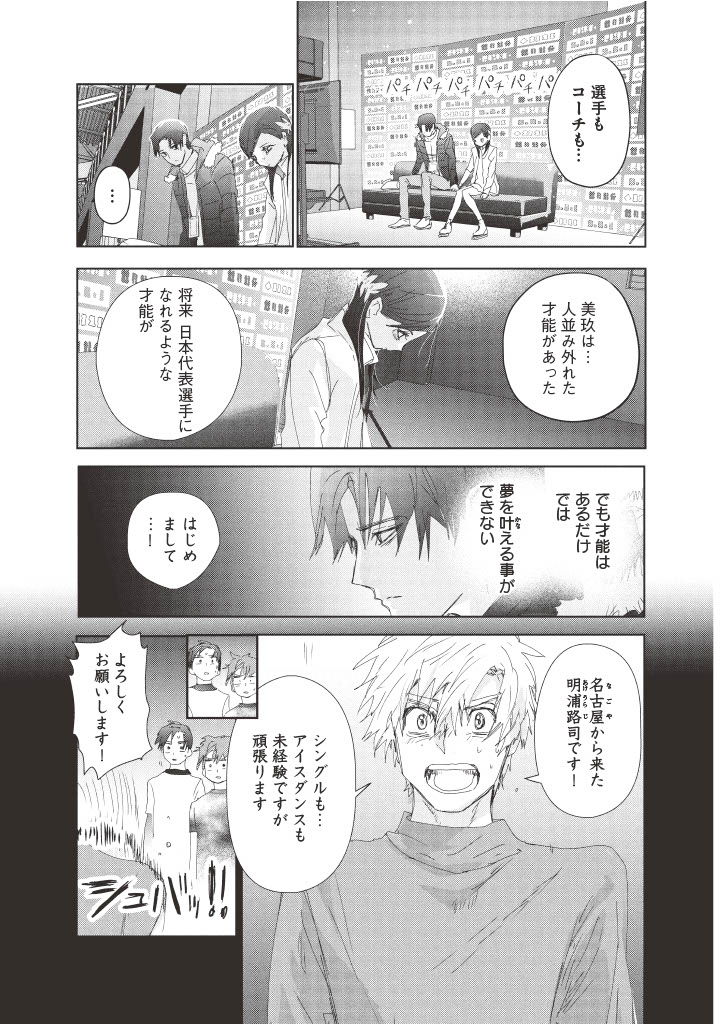 ―司は、経済的な理由でフィギュアスケーターの夢をあきらめた。金銭面や周囲のサポートなど、高いレベルのスケーターを目指すためのリアルな要素も描く。