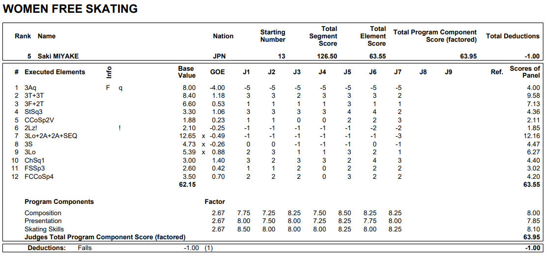 フィギュアスケートのチャレンジャー・シリーズ(CS)、木下グループ杯第2日は6日、大阪府の関空アイスアリーナで行われ、女子は国際大会初出場でショートプログラム(SP)2位の三宅咲綺(シスメックス)がフリー5位となり、合計196・79点で3位に入った。