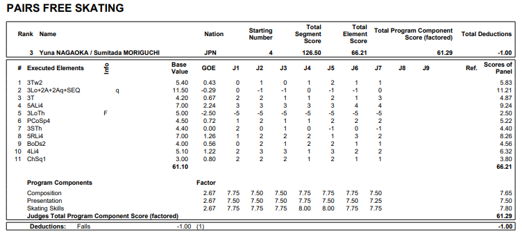 長岡「トリプルツイストを入れたり、サイドバイサイドジャンプをしっかり決めたり、スロージャンプも片方は失敗しましたが、サルコーは耐える形になりながらも降りることができて、リフトも全てレベル4を取れた。まだ改善することはあるんですけど、今季初戦でこの点数をいただけて、成長した証かなと思います」