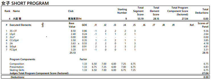 フィギュアスケートの中部選手権第2日は20日、名古屋市の邦和みなとスポーツ&カルチャーで行われ、女子ショートプログラム(SP)で大庭雅(東海東京FH)が55・19点で4位につけた。