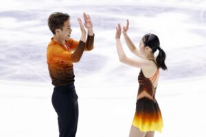 フィギュアスケートのミラノ・コルティナ冬季オリンピック最終予選でペアの出場枠を獲得した長岡柚奈、森口澄士組(木下アカデミー)が22日、開催地の北京から関西空港に帰国し、報道陣の取材に応じた。