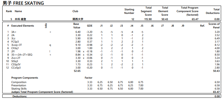 フィギュアスケートの近畿選手権は5日、京都府宇治市の木下アカデミー京都アイスアリーナで行われ、今季限りで引退する男子の木科雄登(関大)はショートプログラム(SP)3位で迎えたフリーで5位となり、合計180・96点で5位となった。