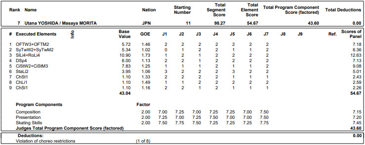 【トビリシ共同】フィギュアスケートのチャレンジャー・シリーズ(CS)トリアレティ杯第2日は10日、ジョージアの首都トビリシで行われ、吉田唄菜、森田真沙也組(木下アカデミー)はフリーで98.27点の7位となり、合計167.96点でリズムダンス(RD)から変わらず5位だった。