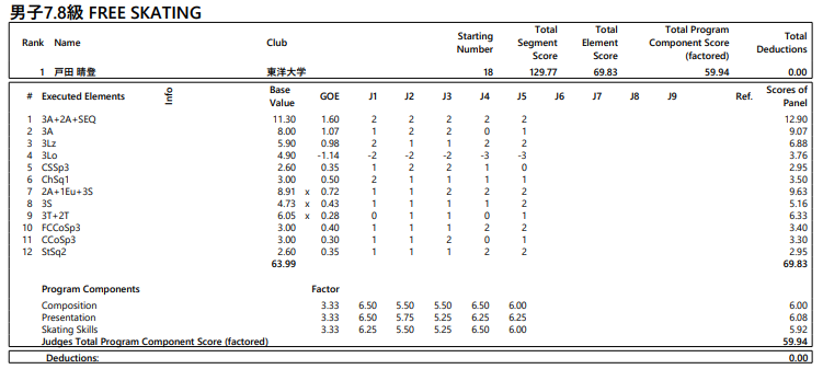 フィギュアスケートのフリーのみで争う東日本学生選手権は12日、東京辰巳アイスアリーナで行われ、男子は戸田晴登(東洋大)が129.77点で初優勝した。