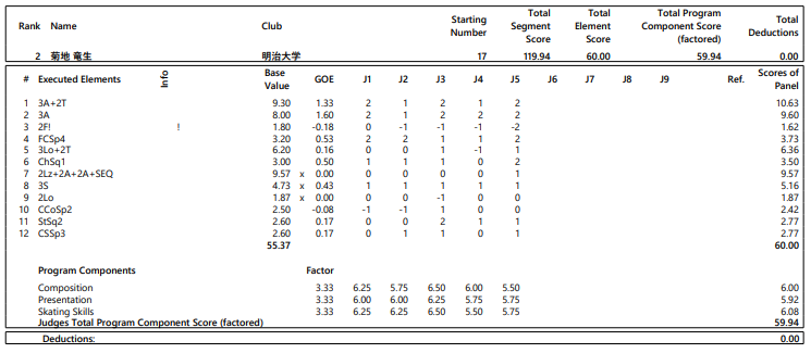 フィギュアスケートのフリーのみで争う東日本学生選手権は12日、東京辰巳アイスアリーナで行われ、男子は菊地竜生(明大)が119.94点で2位となった。