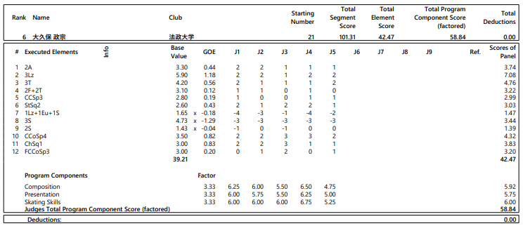 フィギュアスケートのフリーのみで争う東日本学生選手権は12日、東京辰巳アイスアリーナで行われ、男子は大久保政宗(法大)が101.31点で6位となった。
