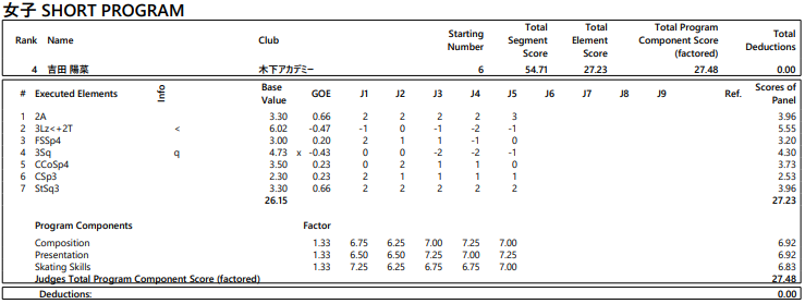 「まだまだ直せるところだったり、レベルとかも取れてないと思うので、 そこはしっかりグランプリに向けて直していかないといけないところであるんですけど、 また明日フリーがあるので、フリーではしっかりスピンとステップのレベルが取れるようにそこは集中してやりたいです」