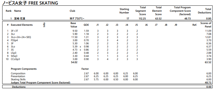 フィギュアスケートの全日本ノービス選手権第1日は18日、横浜市のコーセー新横浜スケートセンターで行われ、A女子は昨年2位の宮崎花凜(MFアカデミー)が冒頭でフリップートーループの2連続3回転ジャンプを決めるなど好演技を見せ、112・25点で初優勝した。