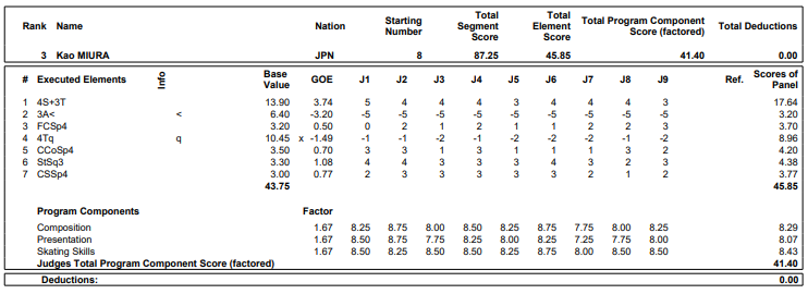 「今(得点の)ディテール見たんですけど。見た上でもあまり納得いかないかなっていうのが正直なところで。4回転トーループはちょっと降り方がいつもは氷に対してトーから来るんですけど、そこがエッジでトンと降りてきた形にはなったので。減点というか加点(基礎点が減らされない)の範囲内で(出来栄え点に)減点が入るのかなと思ったんですけど、しっかり回転が足りないって。そこは足りないことはなかったのかなと思うし。アクセルは全然駄目だったので、そこは納得いくんですけど。あとはPCS(演技点)。きょう、結構スケートが滑っていたから42、43はいくかなと期待していたんですけど。41点にとどまっちゃったし。プレゼンテーションも全体的に出ていないけど、プレゼンテーションが特に出ていないので。ちょっと悲しいなと思ったりしますね」