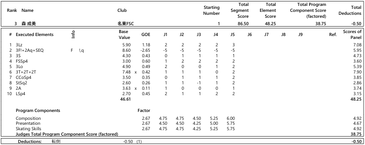「1つ転んでしまったけれど、その後リカバリーだったりを他のジャンプのところでやることができたのでとても満足しています」