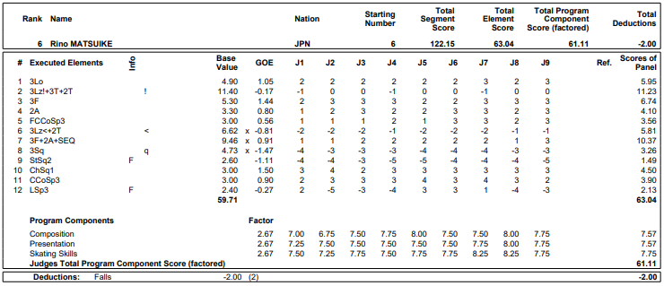 「最後のサルコーはちょっと悔しい部分もあるんですけど、それ以外は自分がちゃんと練習で跳んでいたようなジャンプが出せたんじゃないかなと思うので、すごく安心した矢先にちょっと何ていうか分からない転倒があって、演技を良かったっていう形でまとめることができなかったのはすごく悔しいですし、やっぱりショートでもフリーでも、何かレベルを落としたんだろうなとか、何か引かれているんだろうなっていう点数だったので、そこはほんとに悔しいですし、今日こそはって思ってやっていた部分があったので、点数的にはやっぱりものすごく今は悔しいなっていう感じです」