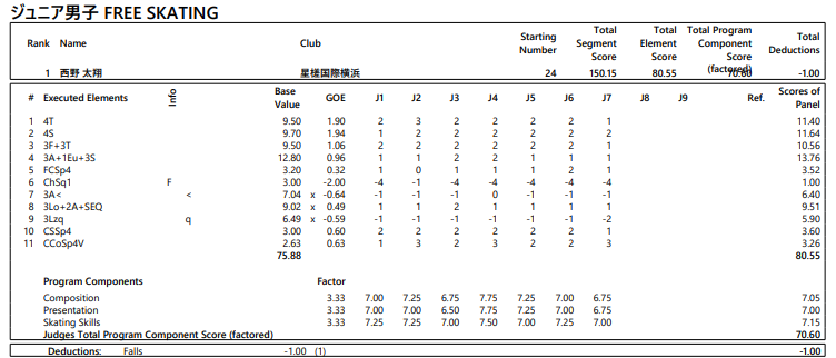 「まず4回転ジャンプ2本をしっかり着氷できたのは、次につながることだと思います。よくなかった点は、コレオシークエンスで、少し前かがみというか、転びそうになってしまった。油断しないように練習を頑張るというのが、今回の試合で経験できたことかなと思います」