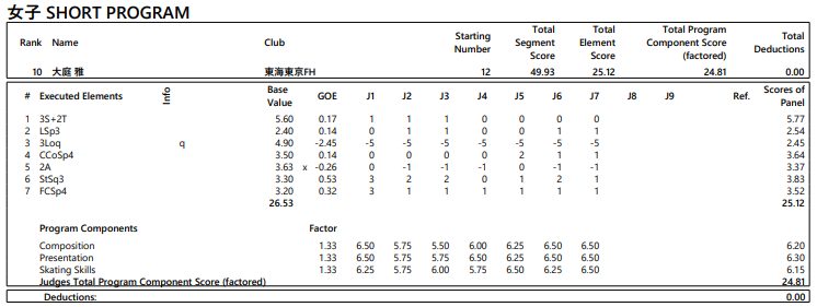 フィギュアスケートのミラノ・コルティナ冬季オリンピック第2次選考会を兼ねた西日本選手権第1日は1日、大津市の木下カンセーアイスアリーナで行われ、女子ショートプログラム(SP)は大庭雅(東海東京FH)が49・93点で10位となった。