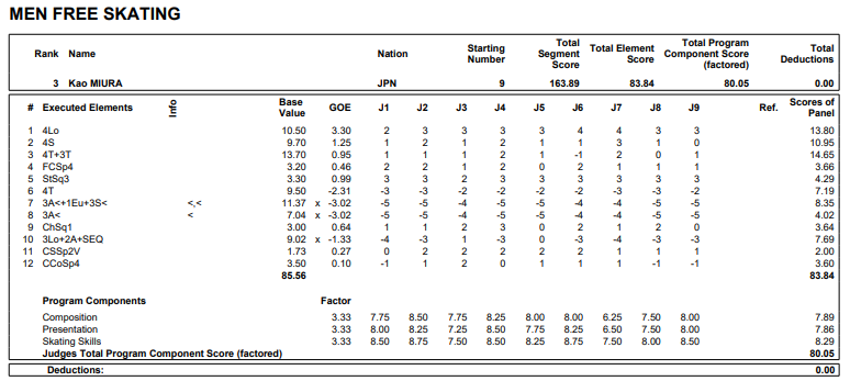 【サスカトゥーン(カナダ)共同】フィギュアスケートのグランプリ(GP)シリーズ第3戦、スケートカナダ最終日は2日、カナダのサスカトゥーンで行われ、男子はショートプログラム(SP)で4位の三浦佳生(オリエンタルバイオ・明大)がフリーで3位となり、合計253・69点で3位に入った。