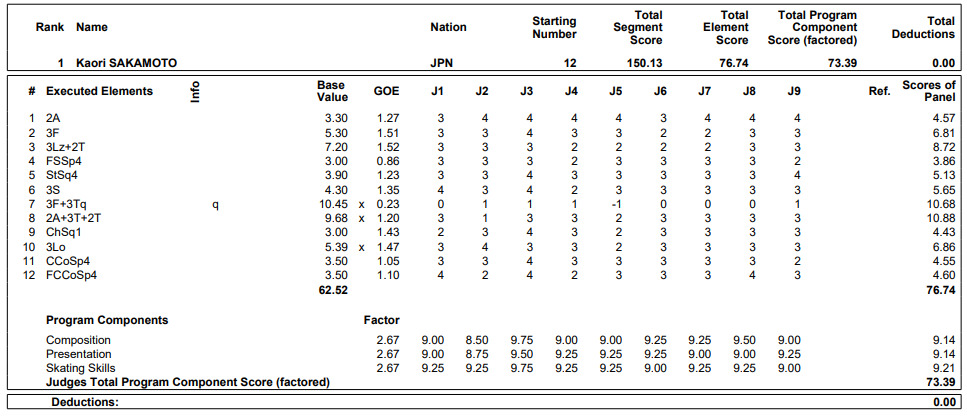 「フリーのリザルトは見られていないので、どこを取りこぼしたとか、また改めて見ようかなと思っているんですけど、ショートの時点で一つ取りこぼしがあって、コンポーネンツも9点台三つとも乗ったとはいえ、やっぱりまだギリギリなので、もう少しやっぱり今日も正直、余裕はあまりなかったので、もうちょっと自信のつく練習が必要だなというのを改めて感じました」
