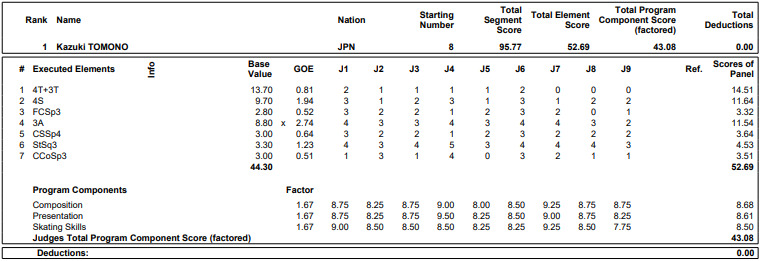 「そうですね、ちょっとジャンプの着氷で、不安な要素も多くて、大丈夫かなって思ったんですけど、ちゃんと点数が反映されていて(4回転-3回転トーループの3回転の)トーはさすがに詰まったんで、点数抑えられたりってのはあったんですけど、全体的にいい演技だったかなと思いますし、ステップもちょっと、最後の最後ちょっとこう、少し攻め切れなかったかなと思うんですけど、今日テーマとして、この大会通して、もう失うもんないんで、もうやっぱりガンガン攻めていこうっていうので、先生と…」