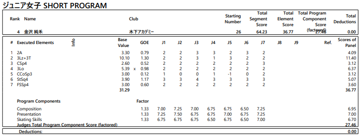 フィギュアスケートの全日本ジュニア選手権は23日、東京辰巳アイスアリーナで開幕し、女子ショートプログラム(SP)で金沢純禾(木下アカデミー)は64・23点で4位につけた。