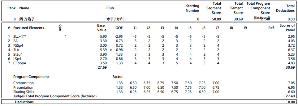 フィギュアスケートの全日本ジュニア選手権は23日、東京辰巳アイスアリーナで開幕してショートプログラム(SP)が行われ、ジュニア・グランプリ(GP)ファイナル(12月・名古屋)に出場する岡万佑子(木下アカデミー)は58.09点の8位で発進した。