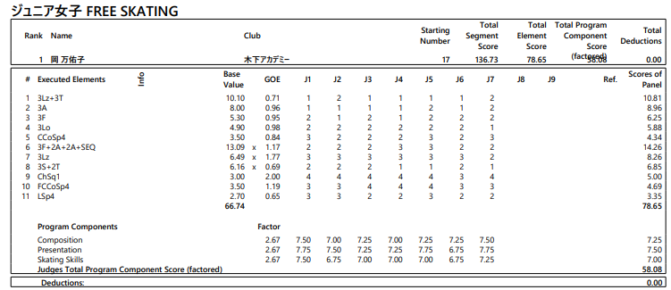 -得点なんですけども、ジュニアグランプリで出した得点よりも高い得点となりました。それについていかがですか。