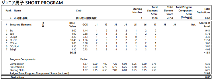 フィギュアスケートの全日本ジュニア選手権は23日、東京辰巳アイスアリーナで開幕してショートプログラム(SP)が行われ、男子で小河原泉颯(岡山理大附属高校)は73.18点で4位につけた。