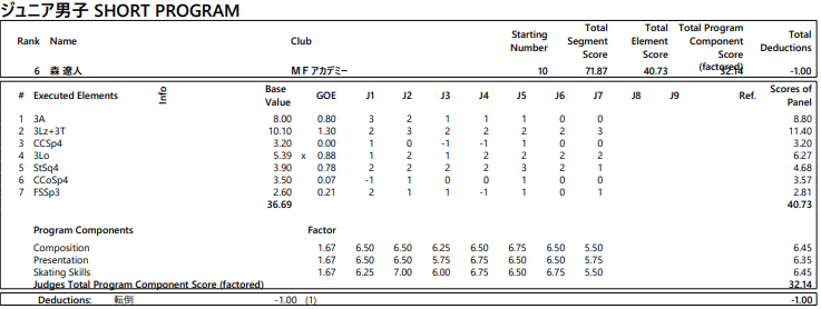 フィギュアスケートの全日本ジュニア選手権は23日、東京辰巳アイスアリーナで開幕してショートプログラム(SP)が行われ、男子で森遼人(MFアカデミー)は71.87点で6位につけた。