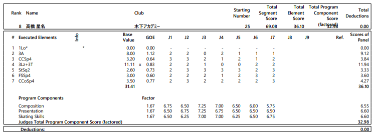 フィギュアスケートの全日本ジュニア選手権は23日、東京辰巳アイスアリーナで開幕してショートプログラム(SP)が行われ、男子で高橋星名(木下アカデミー)は69.08点で8位につけた。