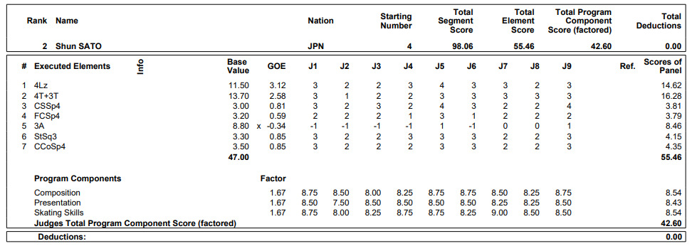 フィギュアスケートのグランプリ(GP)ファイナルは4日、名古屋市のIGアリーナで開幕し、男子ショートプログラム(SP)で佐藤駿(エームサービス・明大)が98.06点で2位につけた。