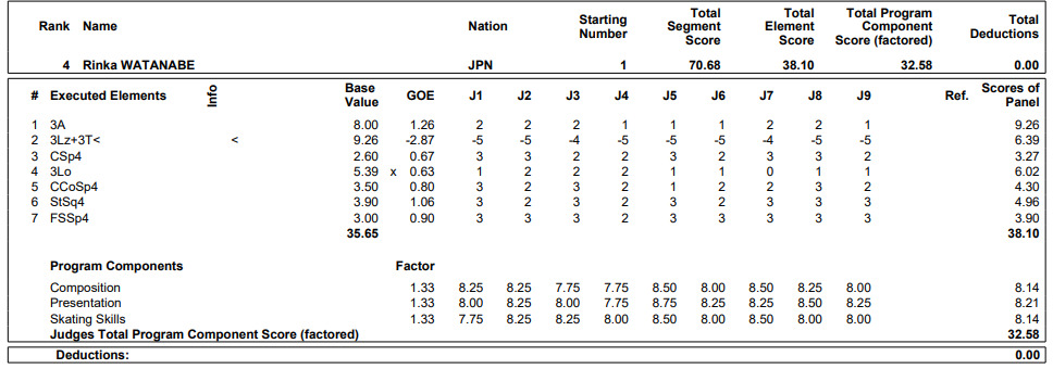 フィギュアスケートのグランプリ(GP)ファイナル第2日は5日、名古屋市のIGアリーナで行われ、女子ショートプログラム(SP)で渡辺倫果(三和建装・法大)は70.68点の4位で発進した。