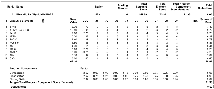 フィギュアスケートのグランプリ(GP)ファイナル第2日は5日、名古屋市のIGアリーナで行われ、ペアの三浦璃来、木原龍一組(木下グループ)は今季世界最高の合計225.21点で3年ぶり2度目の優勝を果たした。ショートプログラム(SP)首位で迎えたフリーは自己ベストの147.89点で2位だった。