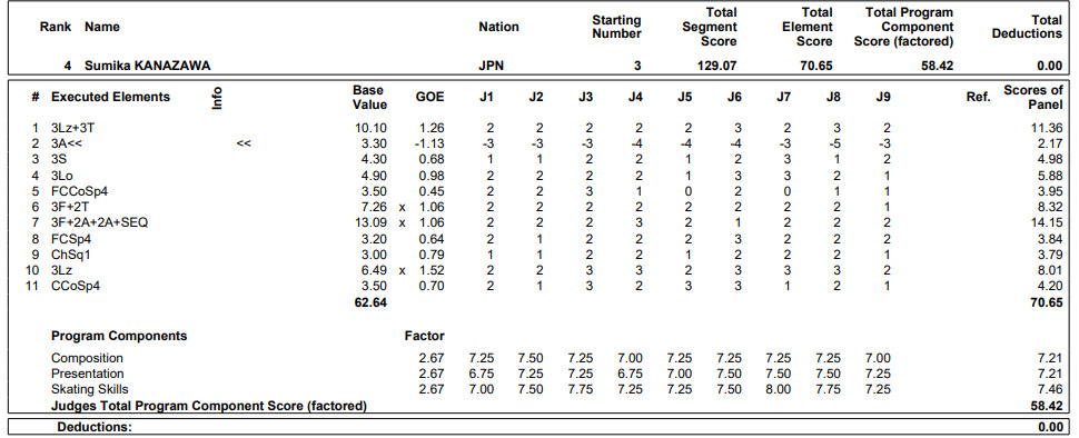 フィギュアスケートのジュニア・グランプリ(GP)ファイナル第2日は5日、名古屋市のIGアリーナで行われ、女子でショートプログラム(SP)4位の金沢純禾(木下アカデミー)はフリー4位となり、合計195.23点で5位だった。