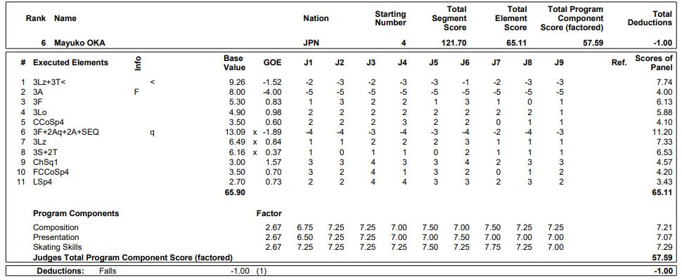 フィギュアスケートのジュニア・グランプリ(GP)ファイナル第2日は5日、名古屋市のIGアリーナで行われ、女子でショートプログラム(SP)3位の岡万佑子(木下アカデミー)はフリーで6位となり、合計189.63点で6位だった。
