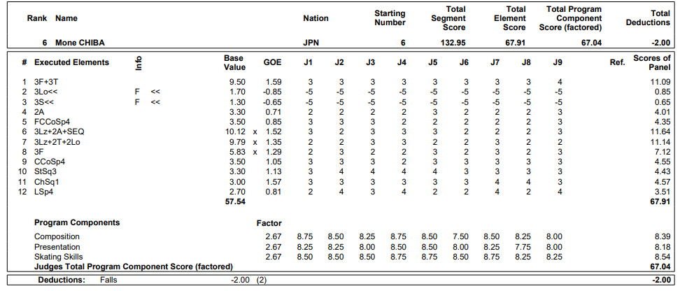 フィギュアスケートのグランプリ(GP)ファイナル最終日は6日、名古屋市のIGアリーナで行われ、女子はショートプログラム(SP)首位の千葉百音(木下グループ)がフリーで6位となり、合計210.22点で5位だった。