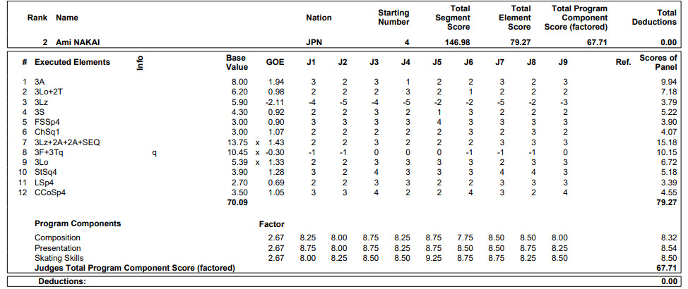 フィギュアスケートのグランプリ(GP)ファイナル最終日は6日、名古屋市のIGアリーナで行われ、女子はショートプログラム(SP)3位だった初出場の17歳、中井亜美(TOKIOインカラミ)がトリプルアクセル(3回転半ジャンプ)に成功したフリーは146.98点で2位となり、合計220.89点で2位に入った。