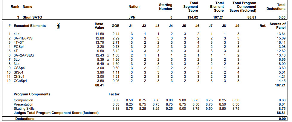 フィギュアスケートのグランプリ(GP)ファイナル最終日は6日、名古屋市のIGアリーナで行われ、男子でショートプログラム(SP)2位の佐藤駿(エームサービス・明大)はフリー3位となり、合計292.08点で昨年に続いて3位だった。