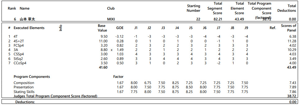 「自信がある4回転-3回転でミスが出てしまって、少し不安が残るサルコーでリカバリーをしなきゃいけない状況になって、少し弱気な自分も出てきそうなところもあったんですけれども、軌道のところで先生が『行ける!』という声をかけてくださって、思い切っていけたかなと思います。ただ、セカンドがダブルになってしまったので、ほぼ3回転-3回転くらいの点数になってしまうと思いますし、そこからトーループのミスだったりとか、コンポーネンツも少し伸び切らない部分があったので、そういったところが響いてしまったかなと思います」