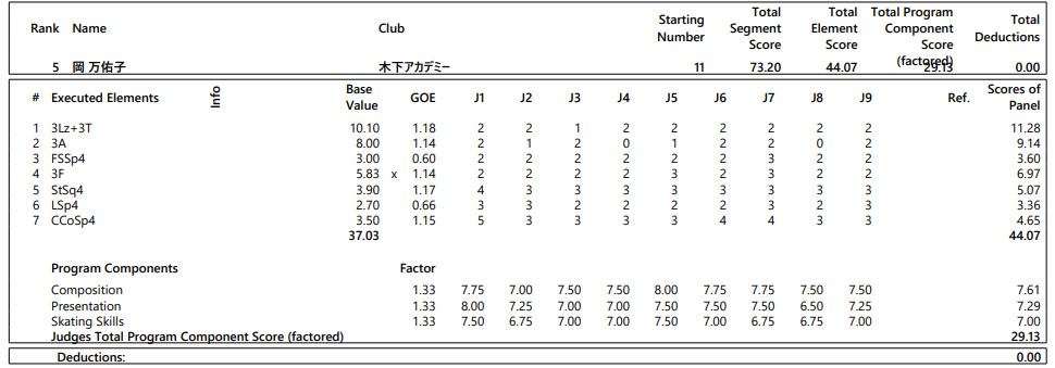 フィギュアスケートのミラノ・コルティナ冬季五輪代表最終選考会を兼ねる全日本選手権は19日、東京・国立代々木競技場で開幕し、女子ショートプログラム(SP)で。ジュニアで代表資格がない岡万佑子(木下アカデミー)は73.20点で5位発進となった。