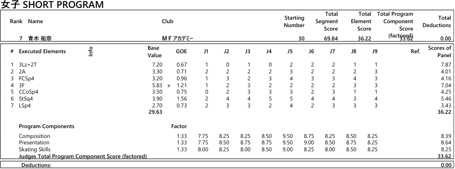 フィギュアスケートのミラノ・コルティナ冬季五輪代表最終選考会を兼ねる全日本選手権は19日、東京・国立代々木競技場で開幕し、女子ショートプログラム(SP)で青木祐奈(MFアカデミー)は69.84点で7位発進となった。