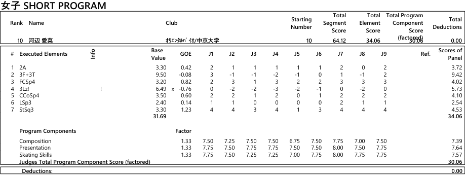 フィギュアスケートのミラノ・コルティナ冬季五輪代表最終選考会を兼ねる全日本選手権は19日、東京・国立代々木競技場で開幕し、女子ショートプログラム(SP)で河辺愛菜(オリエンタルバイオ・中京大学)は64.12点で10位だった。