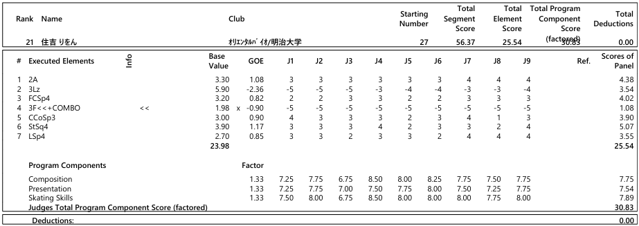 フィギュアスケートのミラノ・コルティナ冬季五輪代表最終選考会を兼ねる全日本選手権は19日、東京・国立代々木競技場で開幕し、女子ショートプログラム(SP)で住吉りをん(オリエンタルバイオ・明治大学)は 56.37点で21位だった。