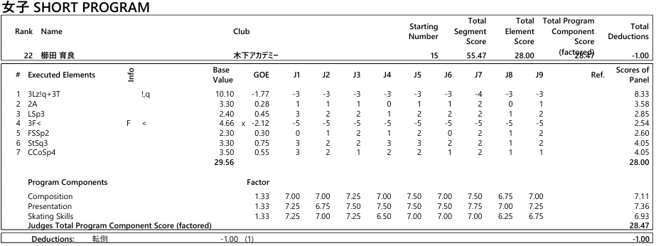 フィギュアスケートのミラノ・コルティナ冬季五輪代表最終選考会を兼ねる全日本選手権は19日、東京・国立代々木競技場で開幕し、女子ショートプログラム(SP)で櫛田育良(木下アカデミー)は55.47点で22位だった。