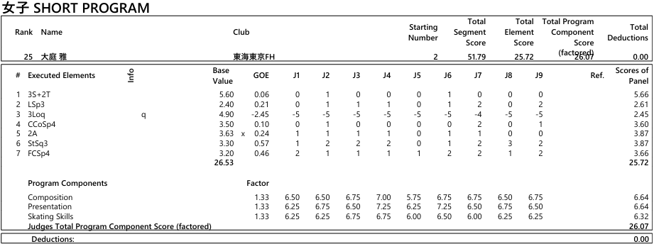 フィギュアスケートのミラノ・コルティナ冬季五輪代表最終選考会を兼ねる全日本選手権は19日、東京・国立代々木競技場で開幕し、女子ショートプログラム(SP)で大庭雅(東海東京FH)は51.79点の25位で、24人で争うフリーへの進出はかなわなかった。