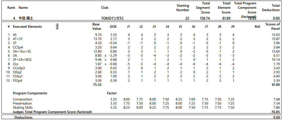 フィギュアスケートのミラノ・コルティナ冬季オリンピック代表最終選考会を兼ねる全日本選手権第2日は20日、東京・国立代々木競技場で行われ、男子はジュニアで代表資格がないショートプログラム(SP)3位の中田璃士(TOKIOインカラミ)がフリーで4位となり、合計248.65点で4位となった。