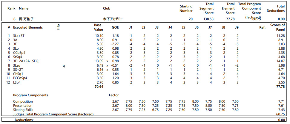 フィギュアスケートのミラノ・コルティナ冬季五輪代表最終選考会を兼ねる全日本選手権最終日は21日、東京・国立代々木競技場で行われ、女子でショートプログラム(SP)5位の岡万佑子(木下アカデミー)はフリー6位となり、合計211.73点で6位だった。岡はジュニアで代表資格がない。