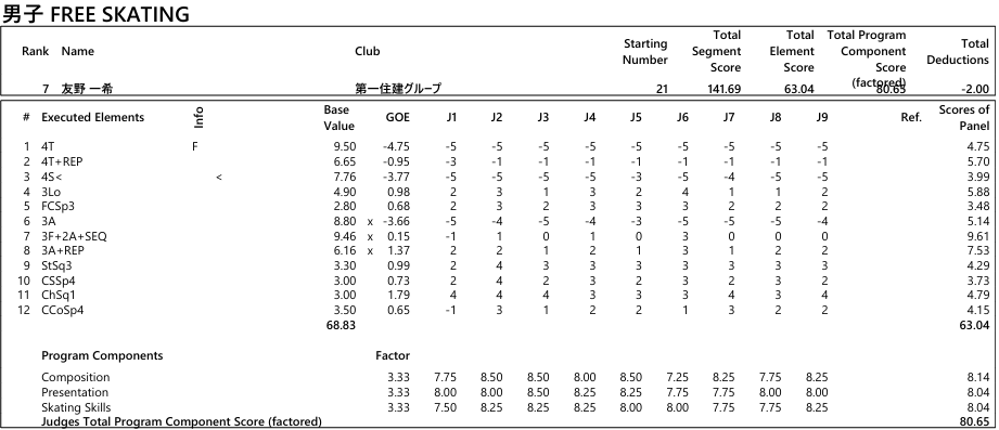 フィギュアスケートのミラノ・コルティナ冬季五輪代表最終選考会を兼ねる全日本選手権第2日は20日、東京・国立代々木競技場で行われ、男子で友野一希(第一住建グループ)はフリー7位となり、合計229.74点で6位だった。