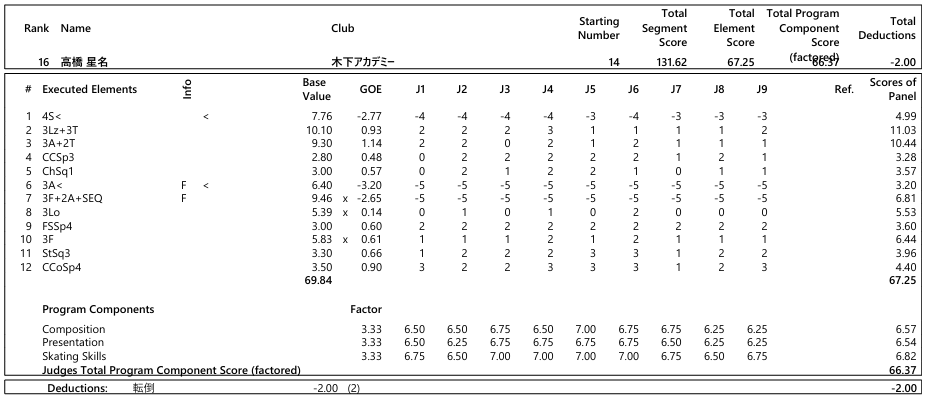 フィギュアスケートのミラノ・コルティナ冬季五輪代表最終選考会を兼ねる全日本選手権第2日は20日、東京・国立代々木競技場で行われ、男子の高橋星名(木下アカデミー)はフリー16位となり、合計205.44点で15位だった。