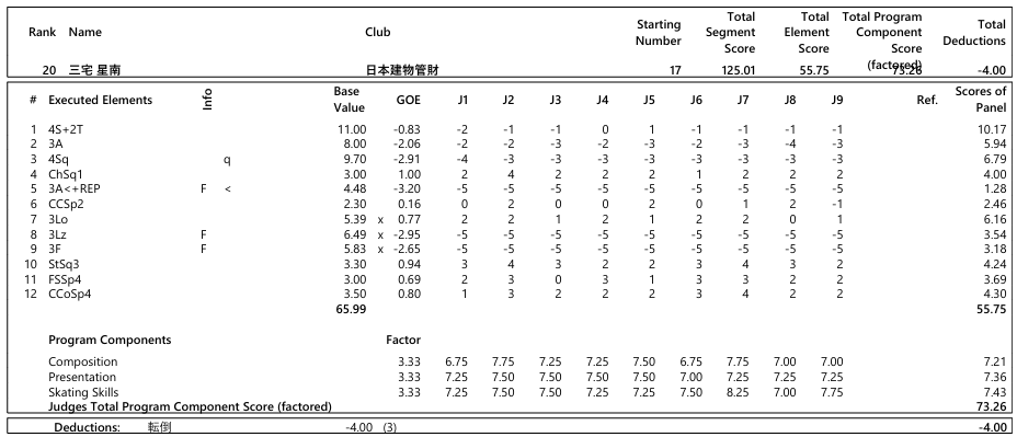 フィギュアスケートのミラノ・コルティナ冬季五輪代表最終選考会を兼ねる全日本選手権第2日は20日、東京・国立代々木競技場で行われ、男子の三宅星南(日本建物管財)はフリー20位となり、合計200.95点で17位だった。