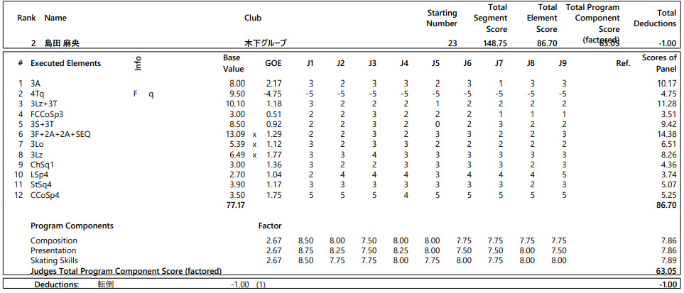 17歳島田麻央、坂本花織に迫る 4回転トーループ転倒も圧倒的な技術点