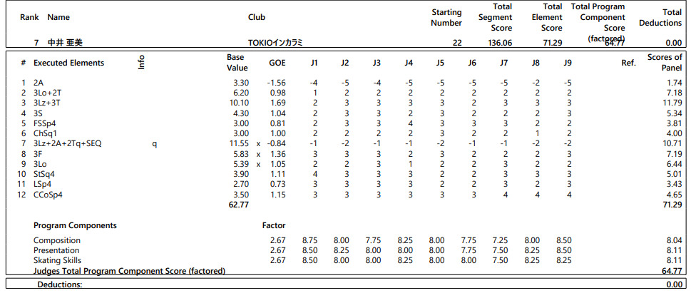 フィギュアスケートのミラノ・コルティナ冬季オリンピック代表最終選考会を兼ねる全日本選手権最終日は21日、東京・国立代々木競技場で行われ、女子でショートプログラム(SP)3位の17歳、中井亜美(TOKIOインカラミ)がフリー7位の合計213.56点で4位となり、初代表に決まった。