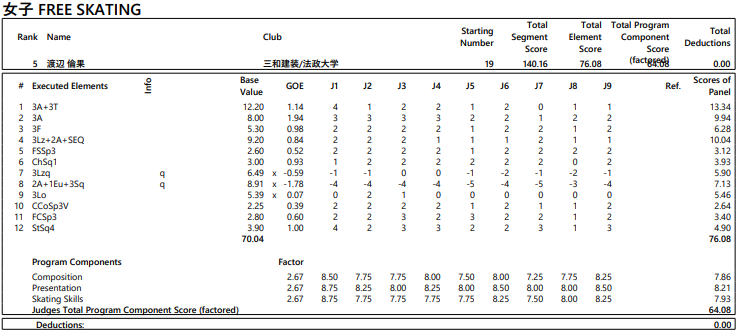 フィギュアスケートのミラノ・コルティナ冬季五輪代表最終選考会を兼ねる全日本選手権最終日は21日、東京・国立代々木競技場で行われ、女子でショートプログラム(SP)6位の渡辺倫果(三和建装・法大)はフリー5位の合計211.52点で7位だった。